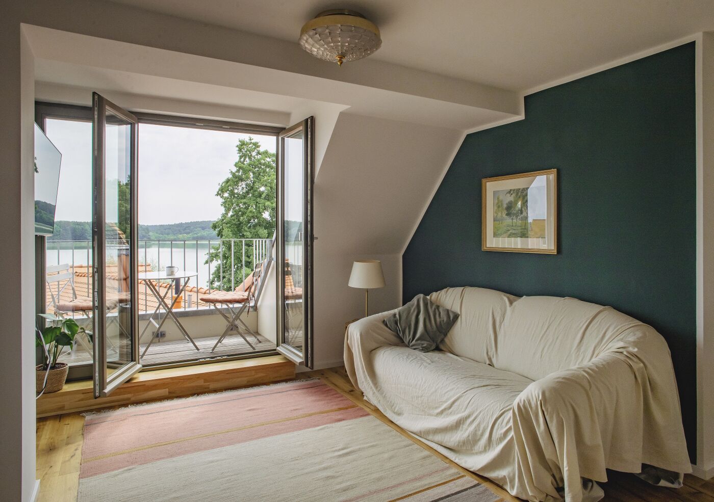 Cozy 58 sqm apartment above the rooftops of Lychen, with a great view of the Oberpfuhl Lake and the nature reserve forest. For one to two people. Fully equipped kitchen and large bathroom with shower.